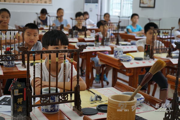 一张张书法桌摆放整齐,桌上教材、毛笔、砚台、宣纸等书法用品一应俱全。教室的墙壁上,处处可见工整秀丽的书法作品……新建的专业书法教室里,老师正在给小学生上课。