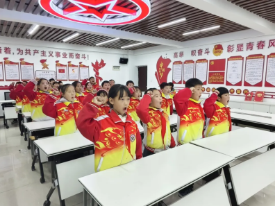 互动环节气氛热烈,队员们踊跃发言,争相分享“科学家造航天飞船”“守护家乡绿水青山”等远大理想,稚嫩话语中饱含着新时代少年的担当与抱负。活动尾声,全体队员高举右拳庄严宣誓,“强国复兴有我”的铿锵誓言响彻校园。